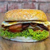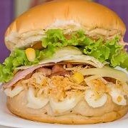 Pão, carne, creme de maionese, queijo assado, bacon, ovo, tomate, alface e batata palha