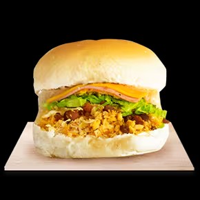 Pão, carne, creme de maionese, queijo assado, presunto, banana, tomate, alface e batata palha