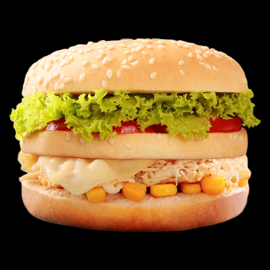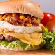 Pão, carne, creme de maionese, muçarela, bacon, tomate, alface, milho e batata palha