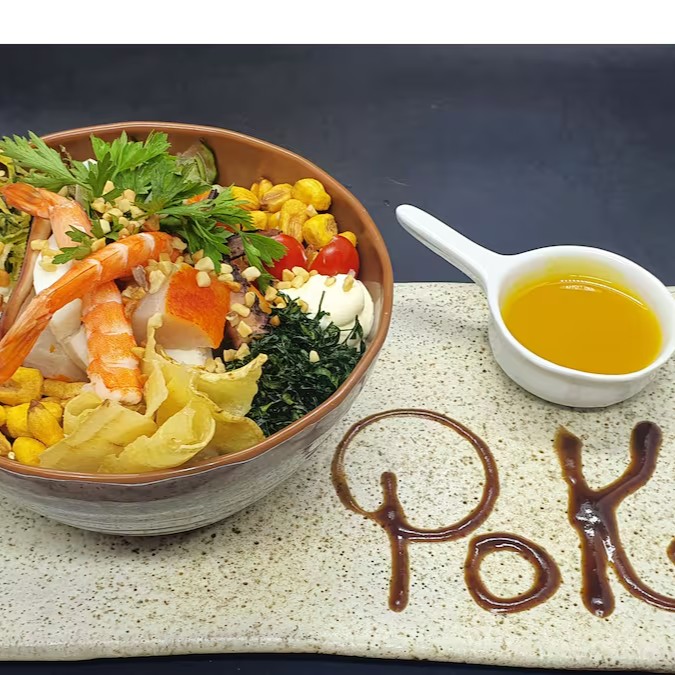 Mix de frutos do mar (salmão, peixe branco defumado, polvo, camarão, lula (100g)), mix de folhas verdes, crispy de couve e alho poró, milho espanhol crocante, tomate cereja, chips de batata doce, sunomono e cream cheese Philadelphia. Molho especial Hawaii e cobertura de castanhas moídas.