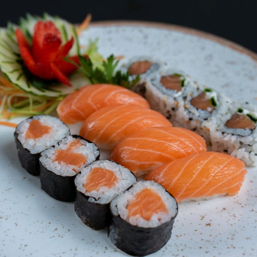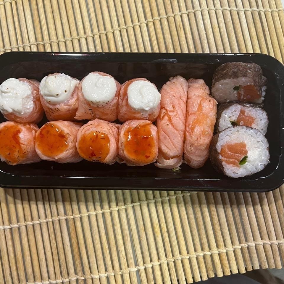 5 Uramaki Filadélfia 5 Maki Salmão 4 Niguiri de Salmão 4 Niguiri Skin Não Acompanha Molhos e Descartáveis. (São vendidos à parte molhos e descartáveis) #sushi#comidajaponesa#sashimi#niguiri#japa#temaki#hot##japonesa #chinesa #shoyo #salmão #camarão #suhi #yakisoba
