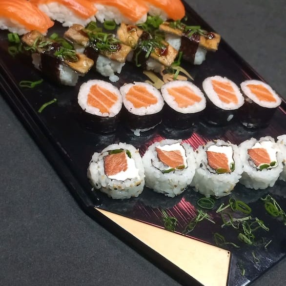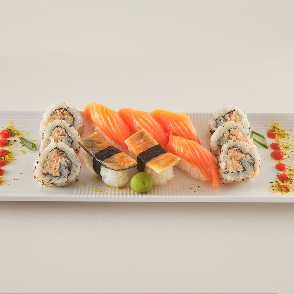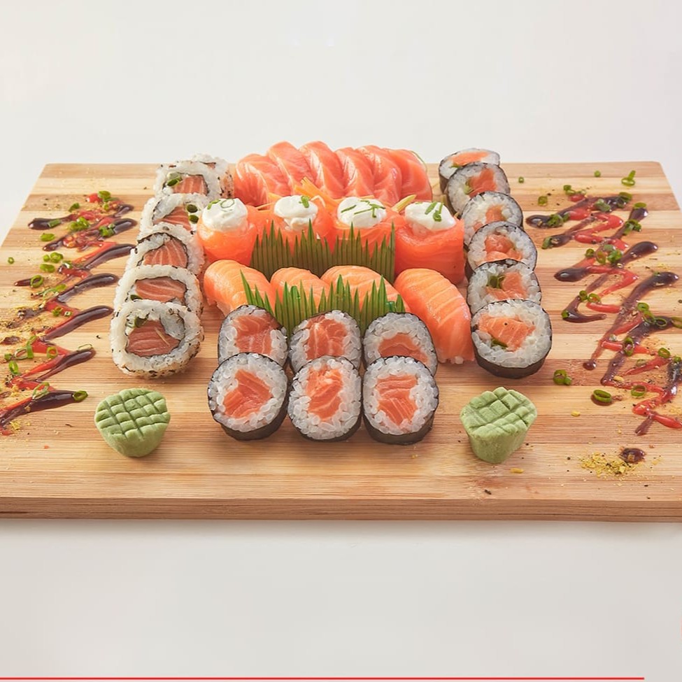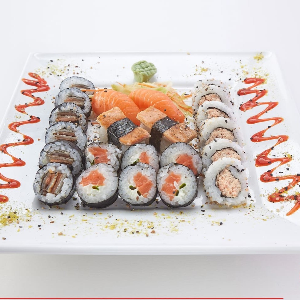 O 'Tóquio' é um espetacular combinado de 32 peças, perfeito para os amantes da culinária japonesa. Este prato é composto por 4 saborosos Gunkan Jyo, 4 deliciosos Niguiri de Salmão, 6 irresistíveis Uramaki Philadélfia, 6 Maki de Salmão fresco e suculento, além de 6 fatias de Sashimi de Salmão e 6 Maki Philadélfia. Uma experiência gastronômica incrível que leva seus sentidos diretamente para Tóquio. Importante: o prato não acompanha shoyu, teriyaki, porta-shoyu e hashi. Por favor, note que não fazemos modificações neste combo.