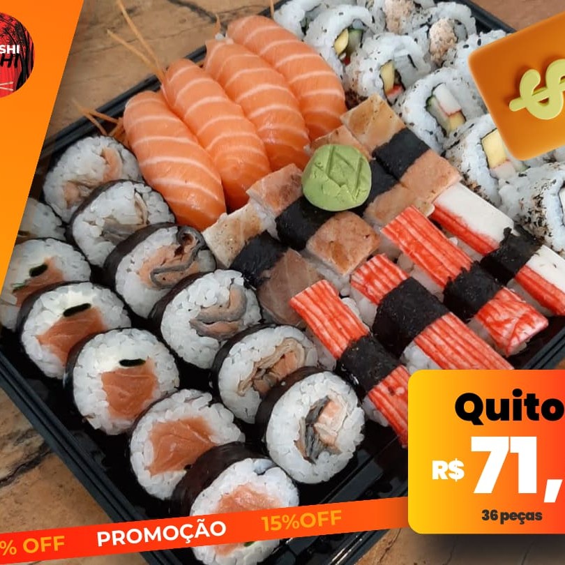 O 'Quito' é um elegante combinado de 36 peças da culinária japonesa, ideal para apreciadores de sushi. Este combinado realça o sabor sofisticado do salmão, presente em 4 peças de Niguiri e 6 de Uramaki grelhado. Inclui também 4 peças de Niguiri Skin e 4 de Niguiri Kani, que encantam pelo sabor delicado e textura irresistível. O clássico Califórnia, com suas 6 peças, traz um toque doce e refrescante, enquanto o Maki Philadélfia e o Maki Kkin, ambos com 6 peças, completam esta seleção com sua combinação harmoniosa de sabores. Por favor, note que não acompanha shoyu, teriyaki, porta-shoyu e hashi. Além disso, não realizamos modificações neste combo.