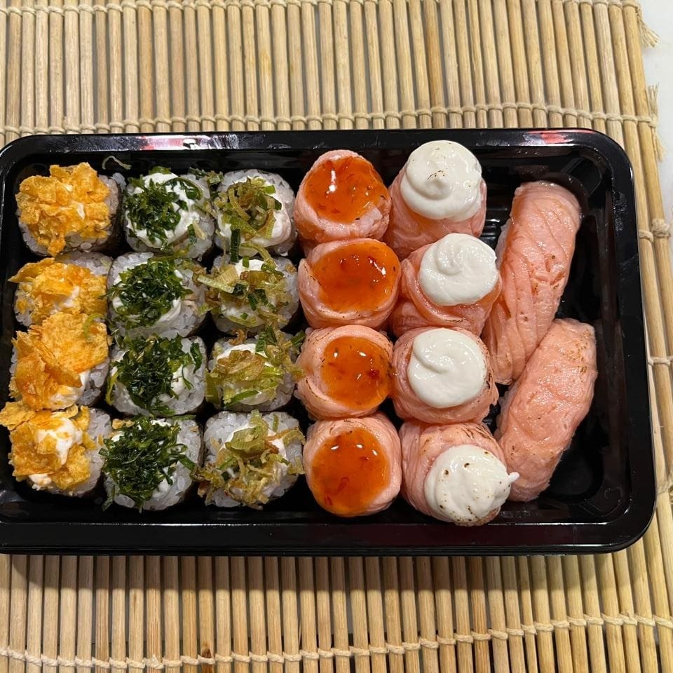 **Executivo 22 peças** - 2 niguiris de salmão flambado - 4 gunkans sweet flambados - 4 gunkans cheese flambados - 4 hot Doritos - 4 hot crisp de couve - 4 hot crisp de alho-poró **Não Acompanha Molhos e Descartáveis.** *(São vendidos à parte molhos e descartáveis)* #sushi #comidajaponesa #sashimi #niguiri #japa #temaki #hot #japonesa #chinesa #shoyo #salmão #camarão #suhi #yakisoba