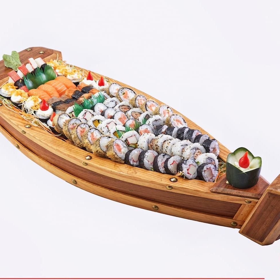 Apresentamos a 'Hayashi I', uma barca esplêndida com 54 peças de sushi, meticulosamente selecionadas para proporcionar uma experiência gastronômica única. Este prato inclui 4 Niguiris de Salmão fresco, 4 Niguiris de Skin crocante, 4 Makis com Pimenta Biquinho picante, 6 Rolls da Califórnia vibrantes, 6 Tortinhas suculentas, 6 Makis Philadelphia cremosos, 6 Makis Skin deliciosos, 6 Uramakis com Salmão Grelhado defumado, 6 Makis Kani saborosos e 6 Hots Philadelphia irresistíveis. Por favor, note que este combo não inclui shoyu, teriyaki, porta-shoyu e hashi, e não permitimos modificações no combo. Aproveite este banquete japonês!