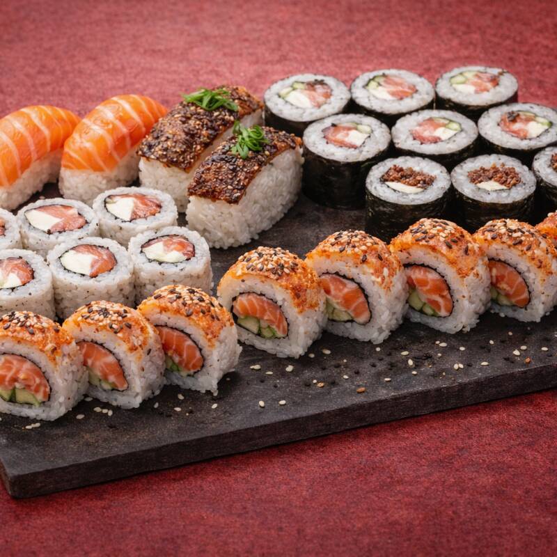 Adentre uma autêntica aventura culinária com o Hayashi Iii, uma barca repleta de 36 peças de sushi cuidadosamente preparadas. Este prato traz 09 peças de Hot Philadelphia de Alho Poró, proporcionando um sabor suave e levemente picante. Outras 09 peças são de Hot Philadelphia de Doritos, com uma crocância inconfundível. Além disso, 09 peças de Hot Philadelphia de Couve oferecem um toque de frescor. Para finalizar, 09 peças de Hot Philadelphia de Geleia de Pimenta, que aguçam o paladar com um delicioso contraste doce-picante. Por favor, note que shoyu, teriyaki, porta-shoyu e hashi não estão inclusos. E ressaltamos que não realizamos modificações neste combo.