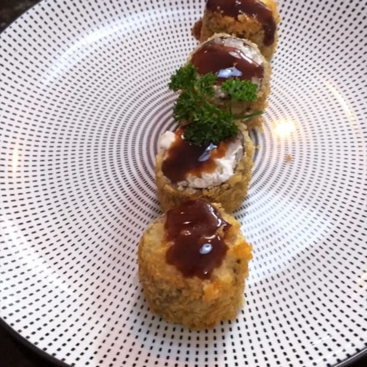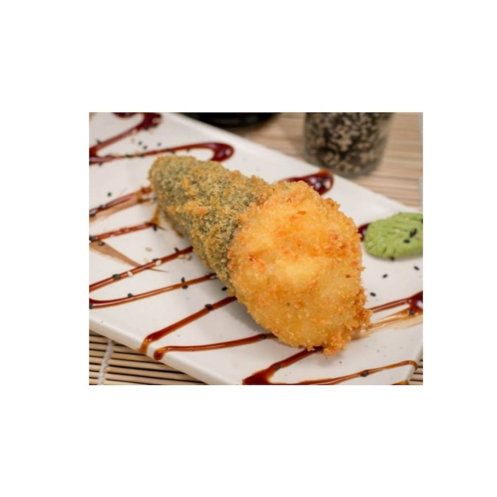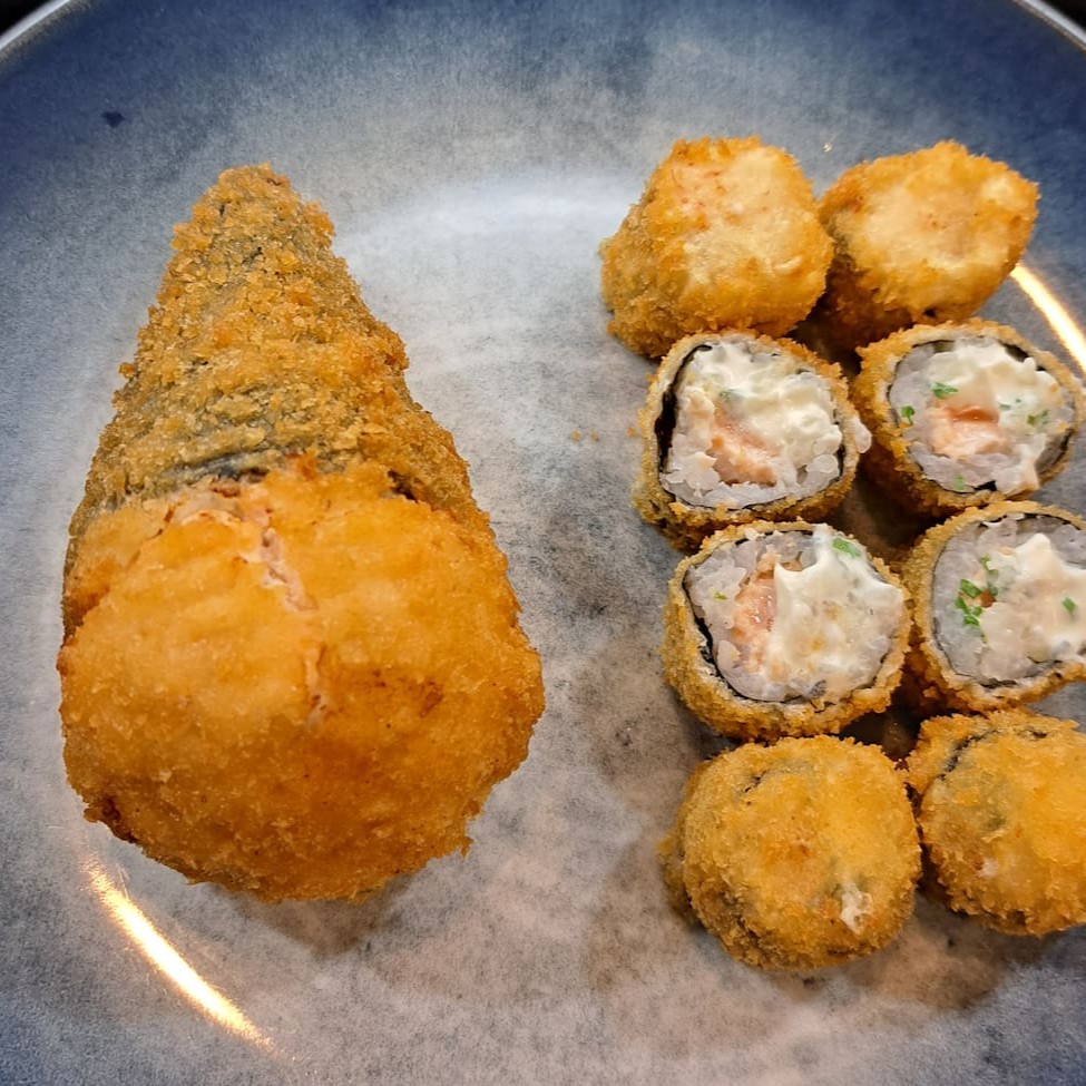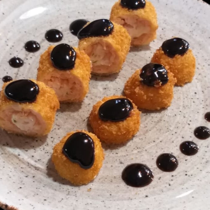 Salmao, cream cheese, cebolinha, empanado e frito e molho tare