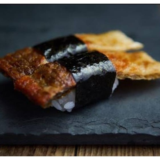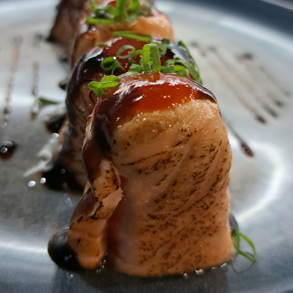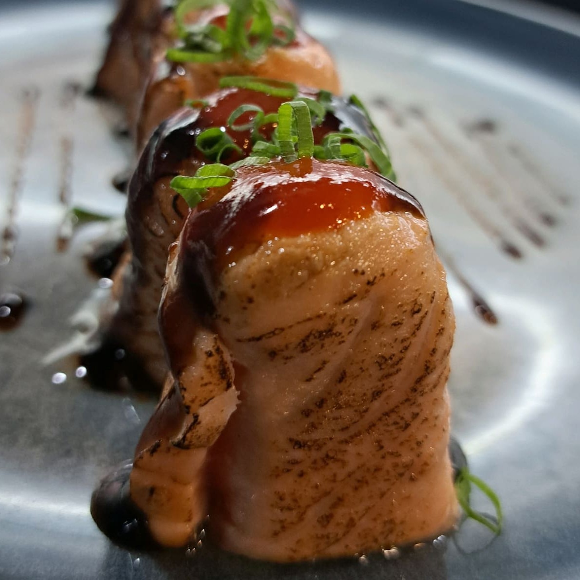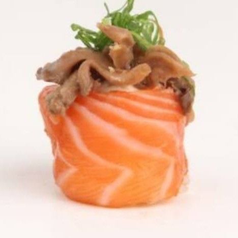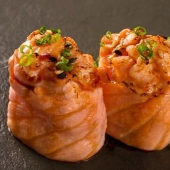 8 peças Salmão grelhado com cream cheese, enrolado na manta de salmão, pimenta shirasha e molho tarê.
