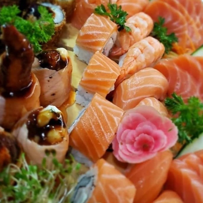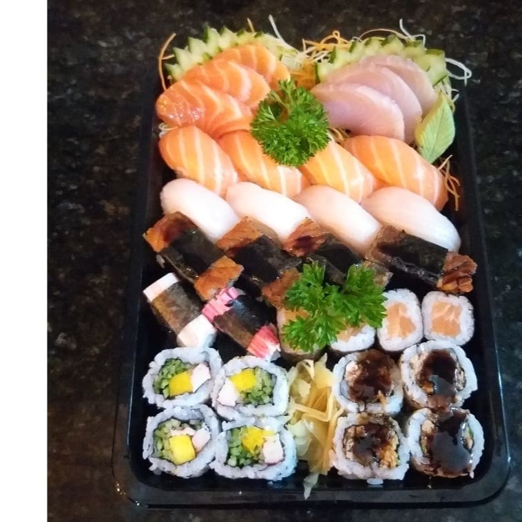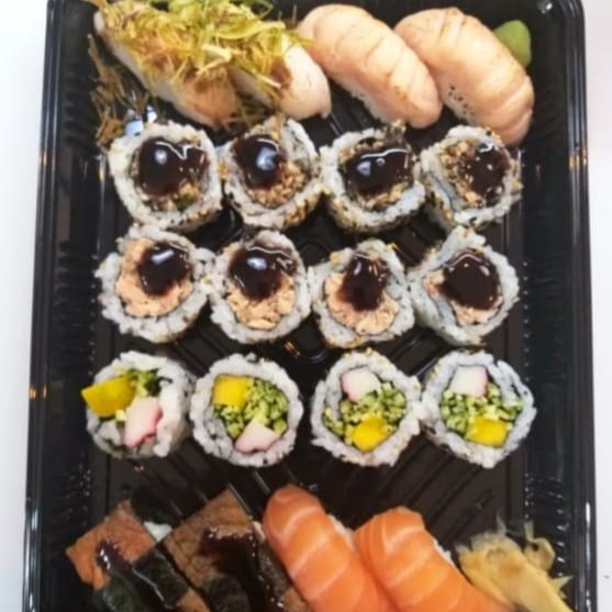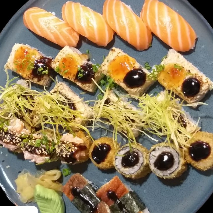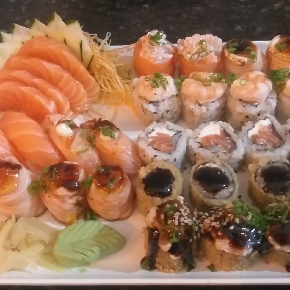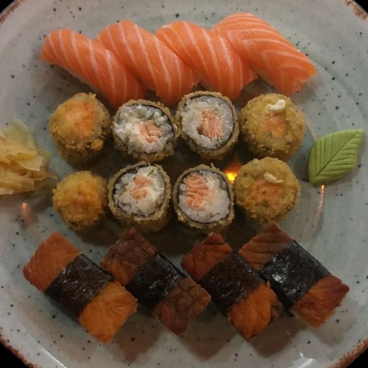 4 salmão,4 peixe branco, 4 kani, 4 salmão skin. makizushi: 4 sakemaki, 4 maki salmão grelhado, 4 philadefia, 4 hot simples, 4 hot especial Todos Os Nossos Combinados Acompanham Hashi , Nozoki ,Shoyu,Wassabi E Gengibre. Para Mais Molhos Cobramos Acréscimo ..( Não Acompanha Tarê)