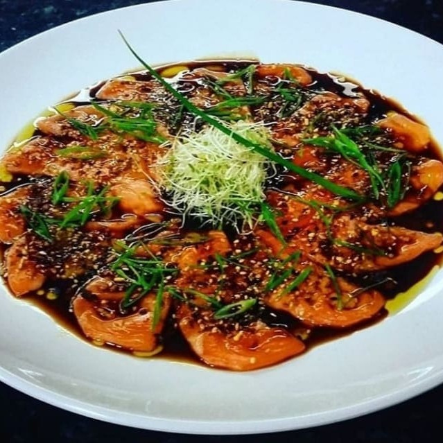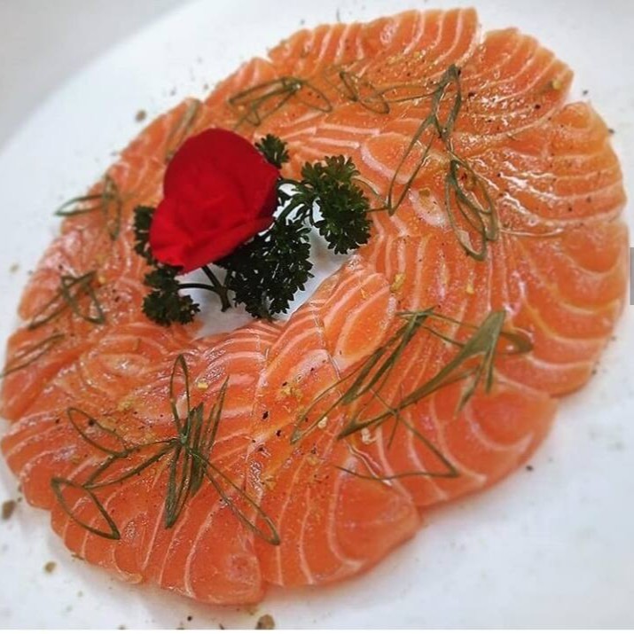 Salmão marinados no limão , azeite, cebola roxa, coentro, pimenta dedo de moça. 300 gramas .