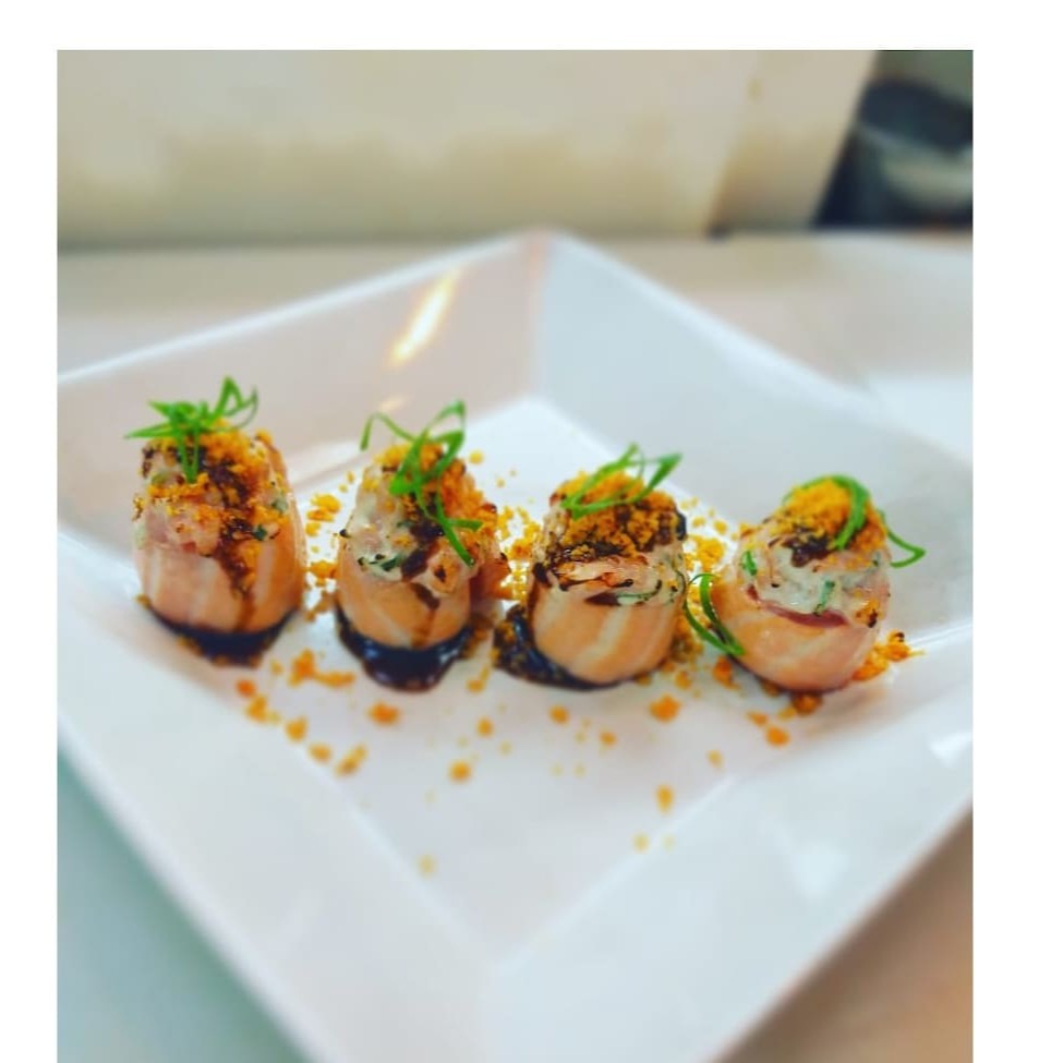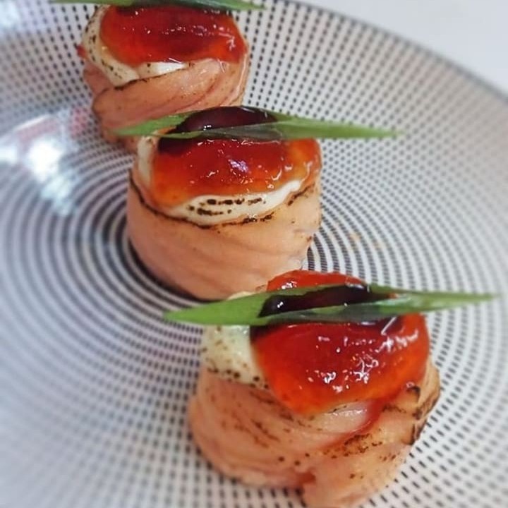 4 peças Salmão grelhado com cream cheese, enrolado na manta de salmão pimenta shirasha e molho tarê.