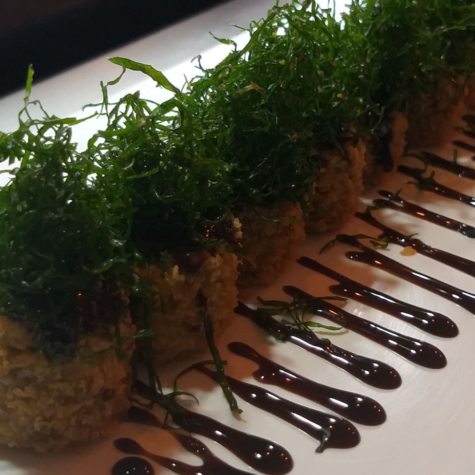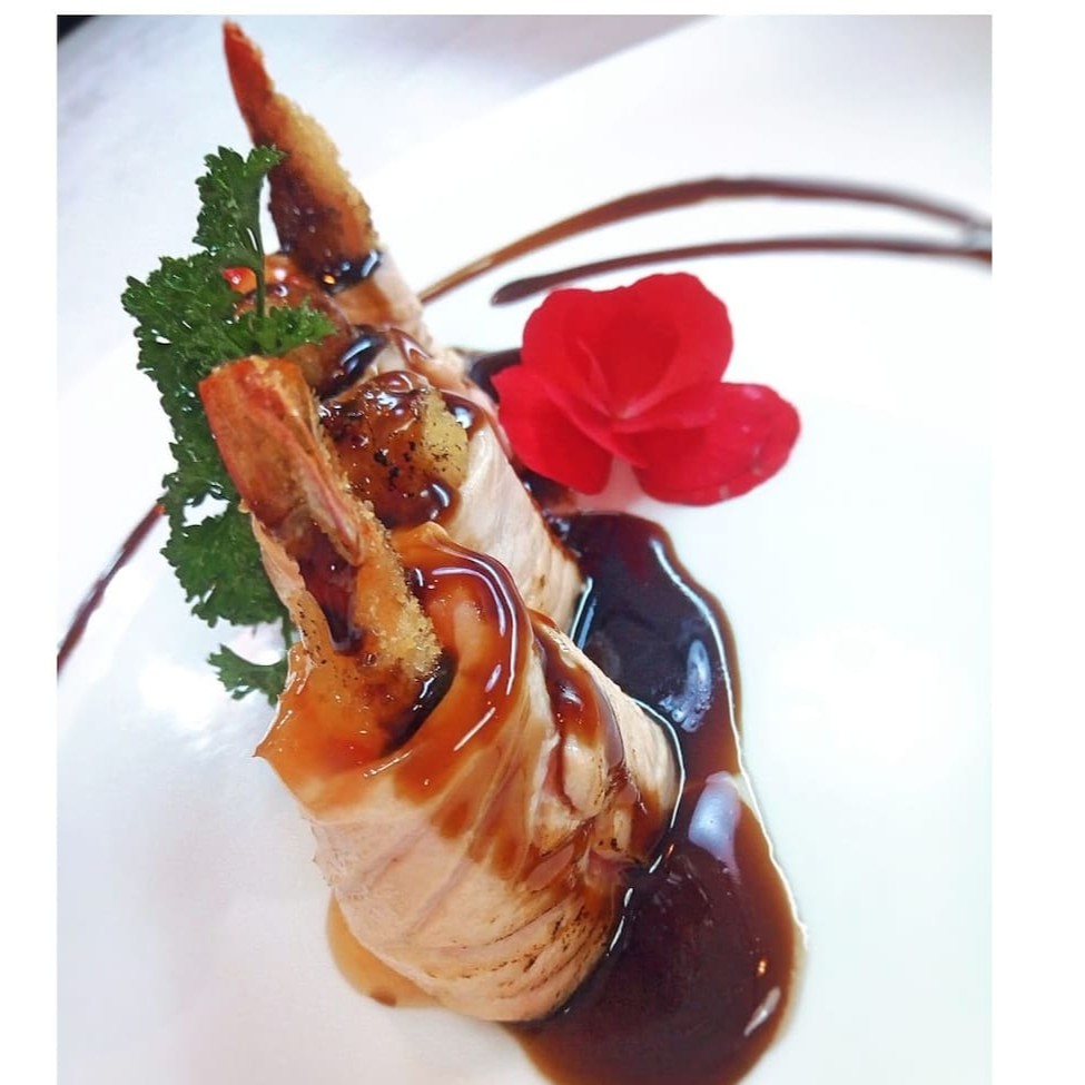 Manta de salmão recheada com camarão, cream cheese, empanado e frito e coberto com molho tare.