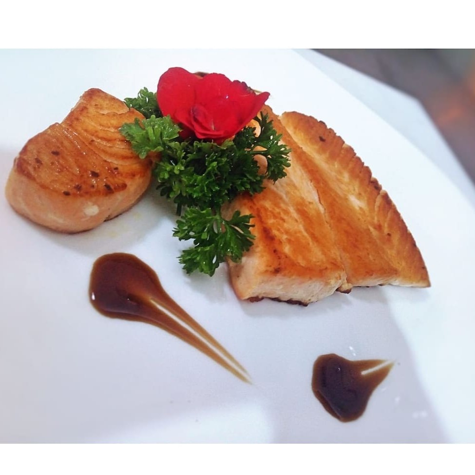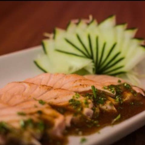 250g de salmão grelhado temperado com pasta de alho e molho tarê.