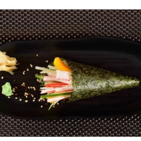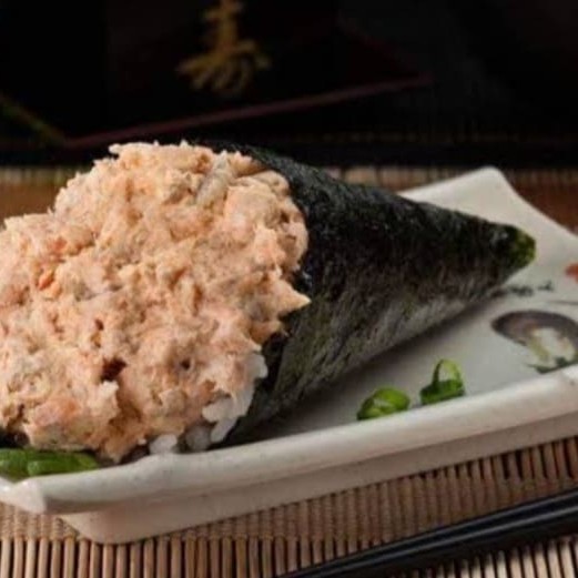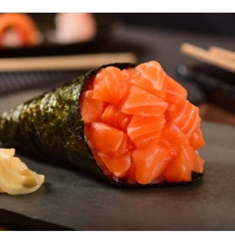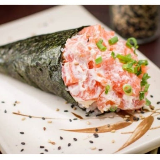 Enrolado em formato de cone, recheado com salmão grelhado, cream cheese , cebolinha e molho tarê.