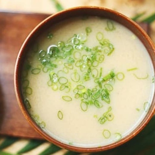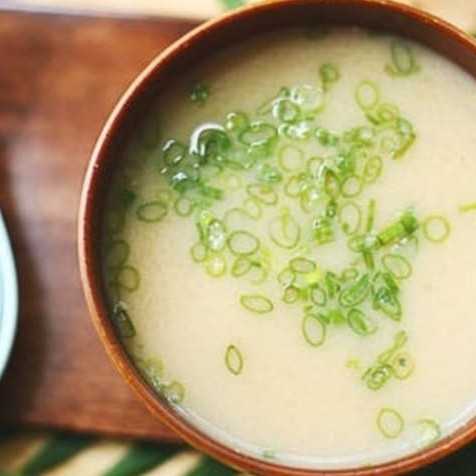 (caldo feito com pasta se soja fermentada, e tempero a base de peixe.)