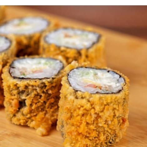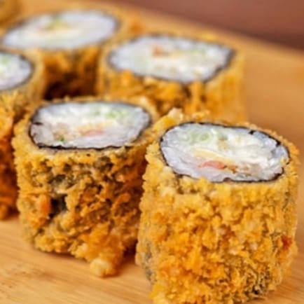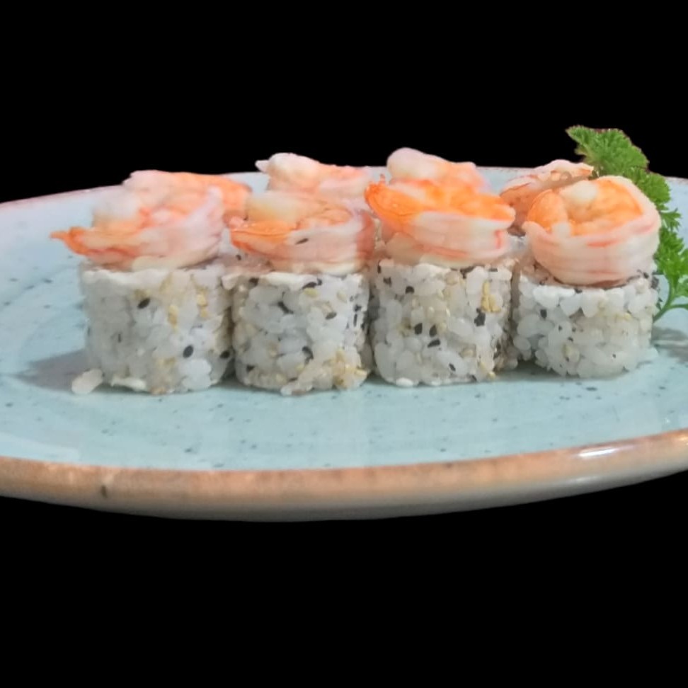 8 peças Camarão empanado, enrolado na manta de salmão, cream cheese cebolinha, tarê e molho apimentado agridoce