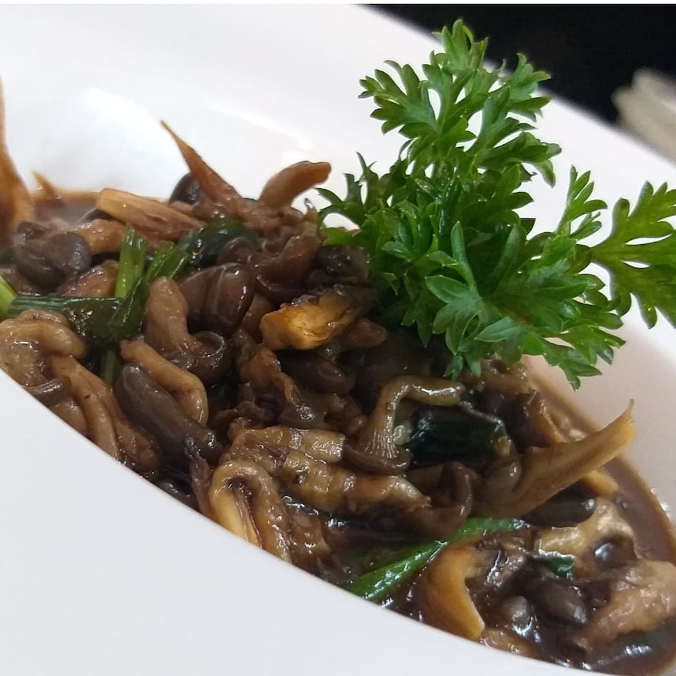 Cogumelos pequenos salteados na manteiga com cebolinha e molho a base de shoyu.