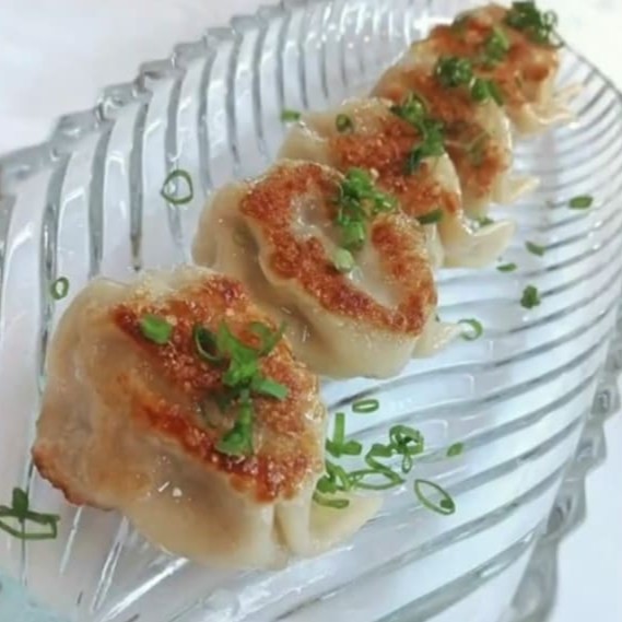 (formatos em pastelzinho japonês, recheados com carne suína e nirá).