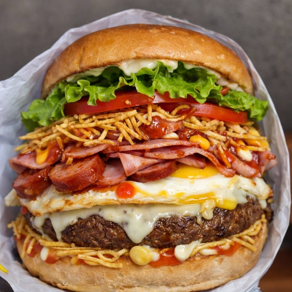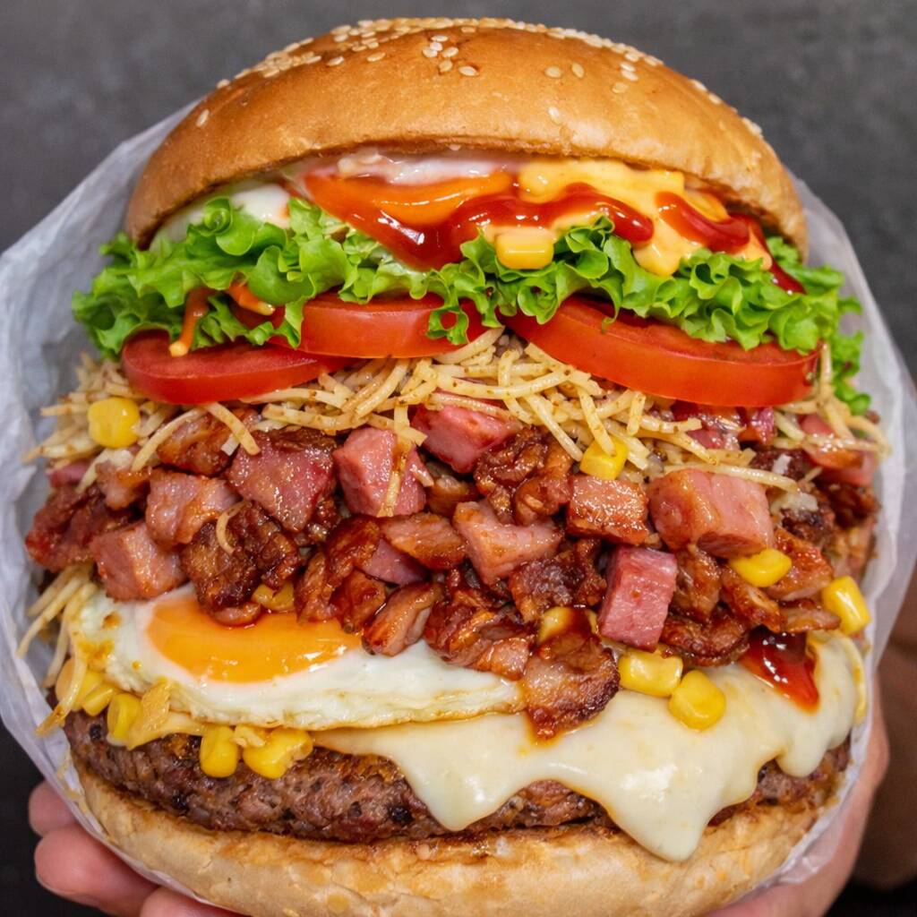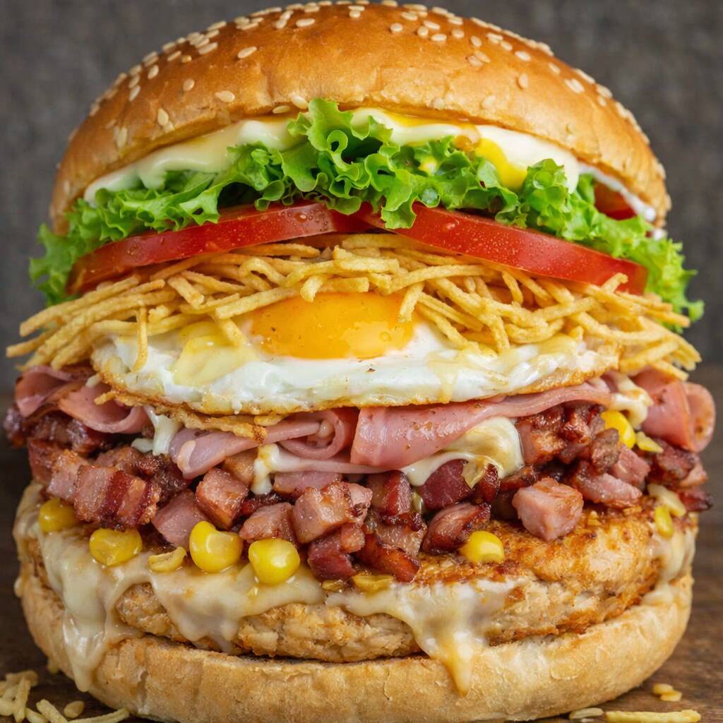 pão, hamburger, ovo frito, queijo derretido, milho, presunto, bacon tostado, alface, tomate, molhos e batata palha