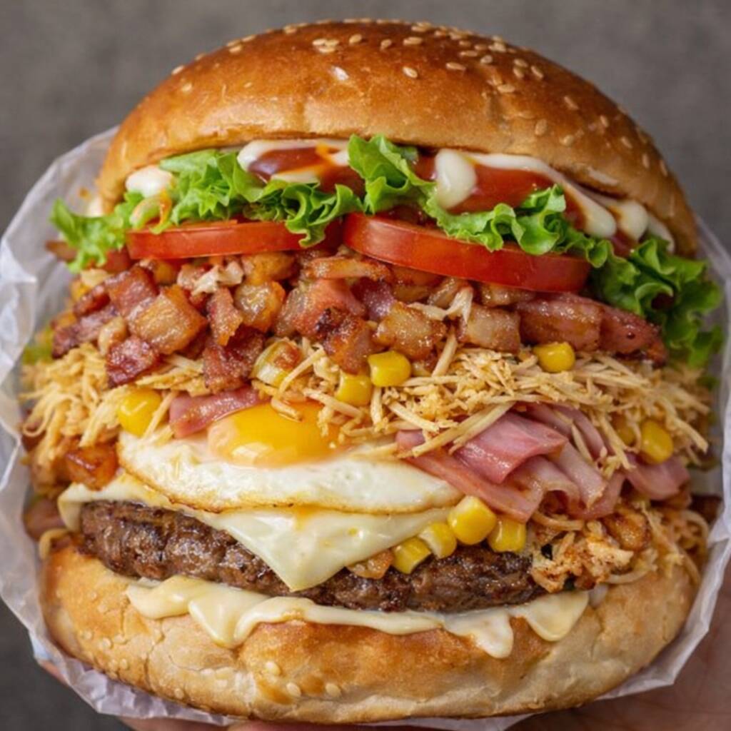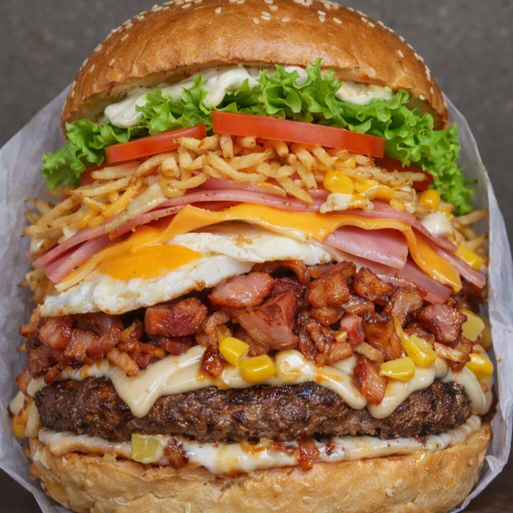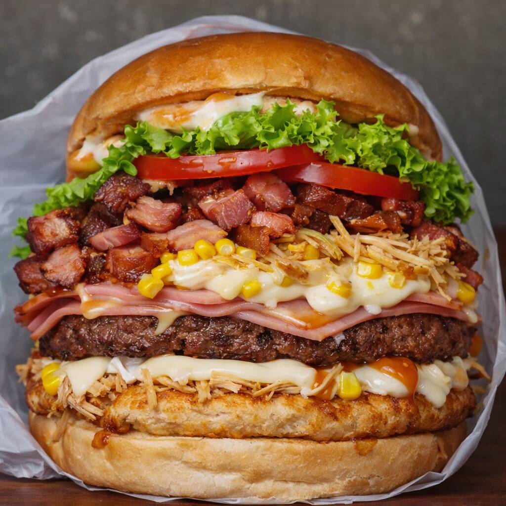 pão, hamburger, ovo frito, queijo derretido, milho, presunto, bacon tostado, alface, tomate, molhos e batata palha