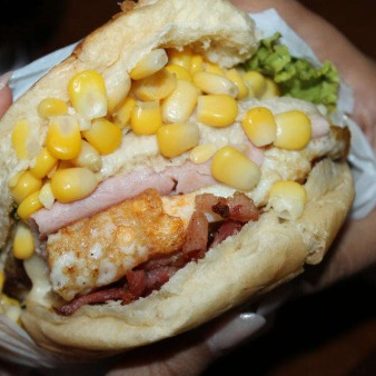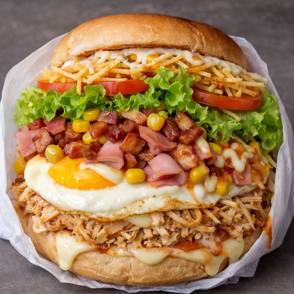 pão, hamburger, ovo frito, queijo derretido, presunto, milho verde, frango desfiado, bacon tostado, alface, tomate, molhos e batata palha
