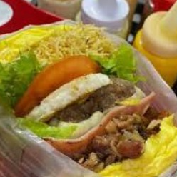 pão, hamburger, ovo frito, queijo derretido, alface, tomate, molhos e batata palha