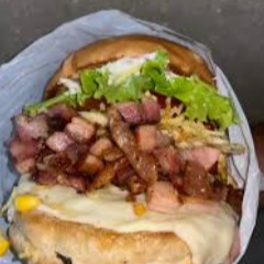 pão, hamburger de frango, hamburger de boi, queijo derretido, presunto, catupiry, milho verde, alface, tomate, molhos e batata palha