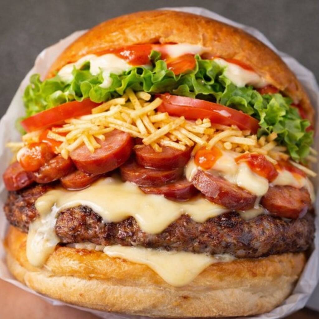 pão, hamburger de picanha, ovo frito, presunto, calabresa fatiada, queijo derretido, alface, tomate, molhos e batata palha