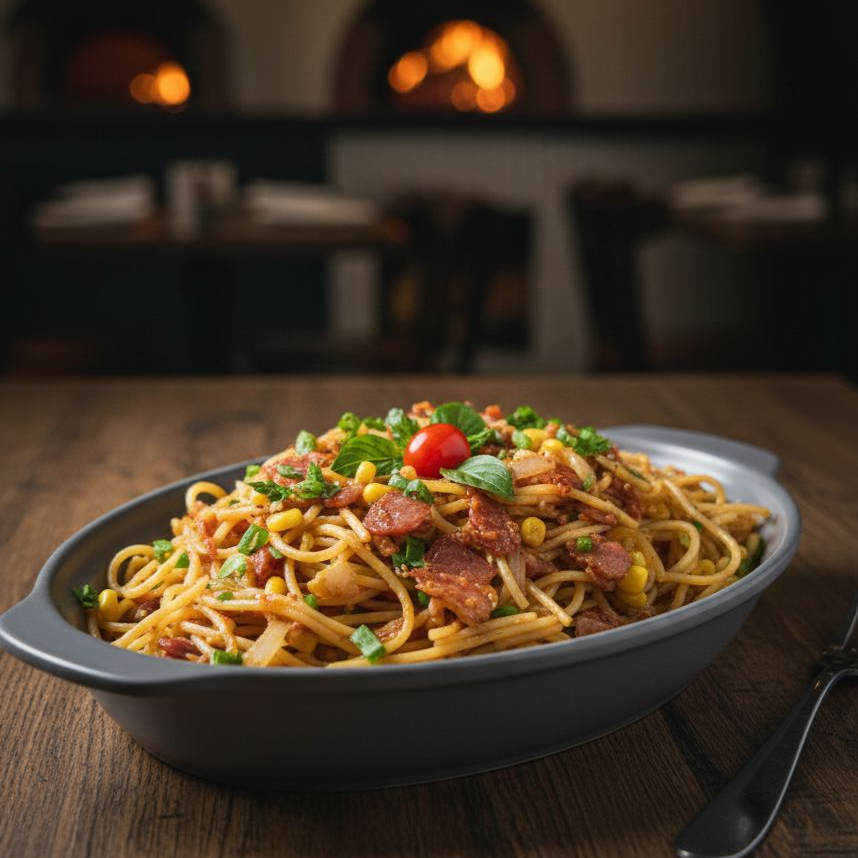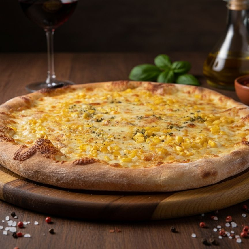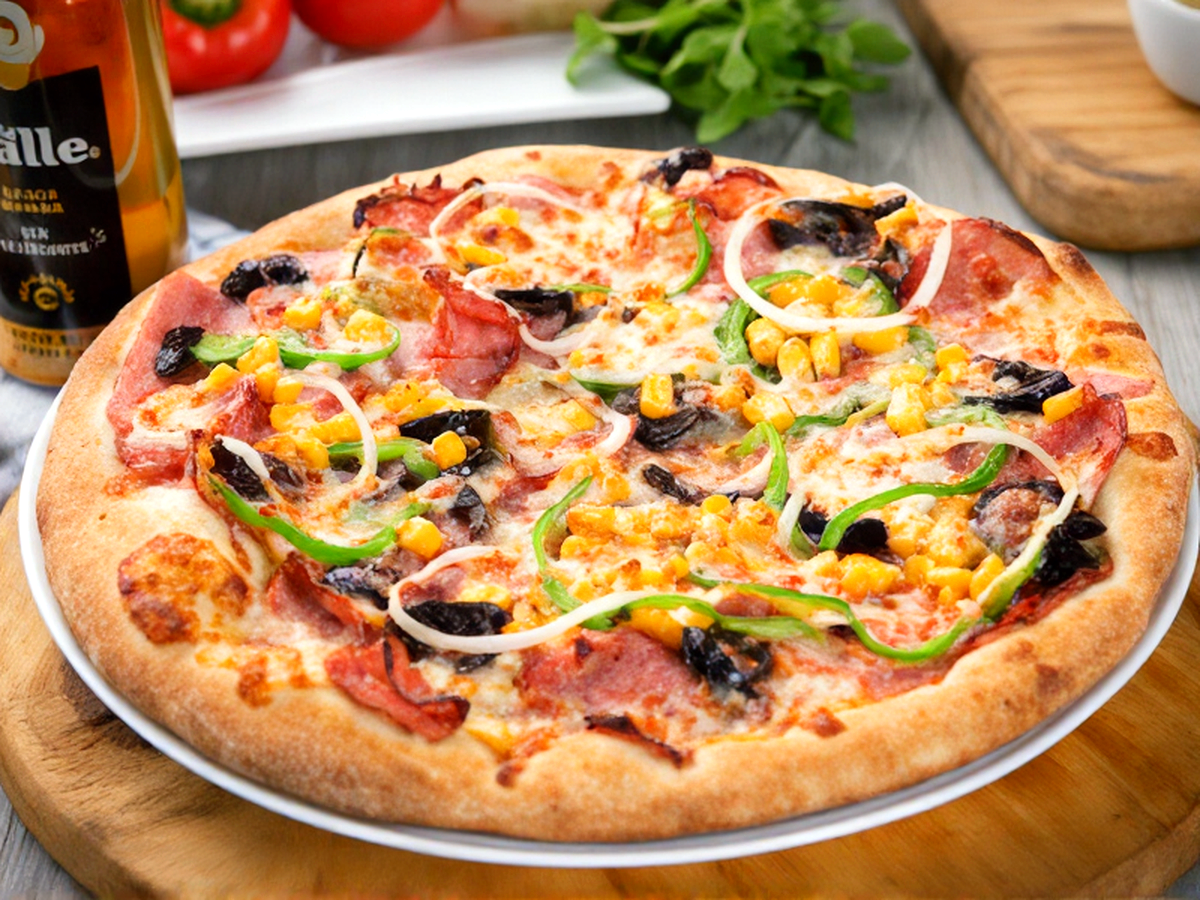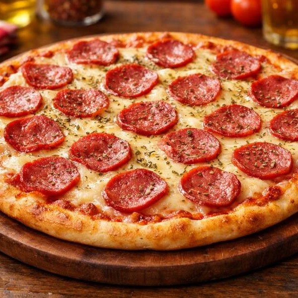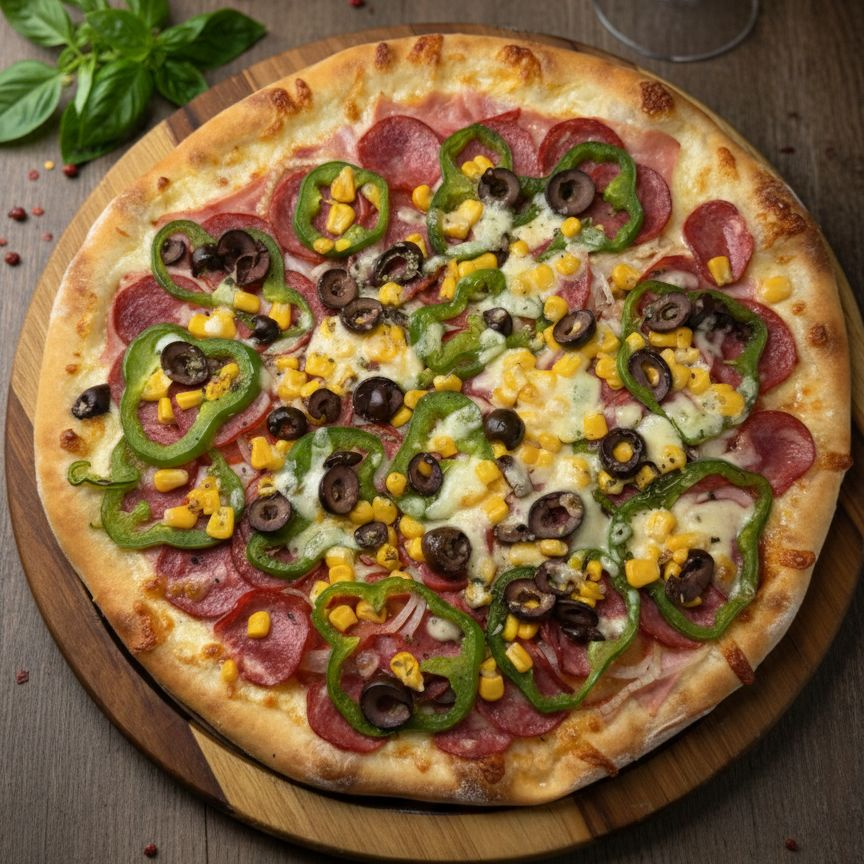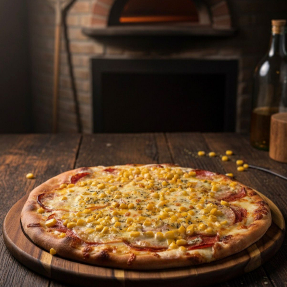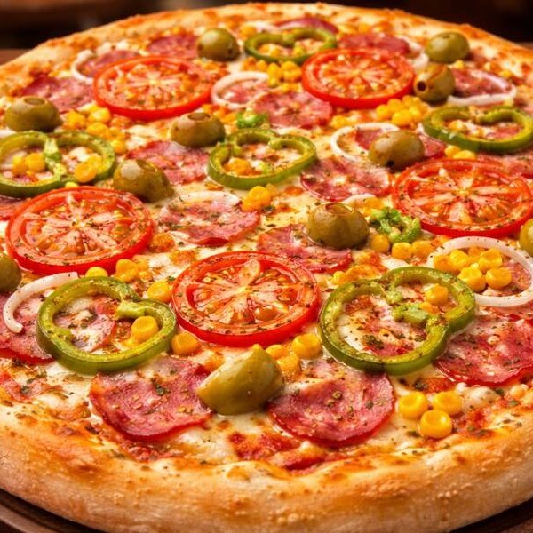 Mussarela, Presunto, Calabresa, Milho, Pimentão, Azeitona, Cebola, Tomate E Orégano
