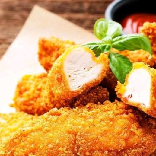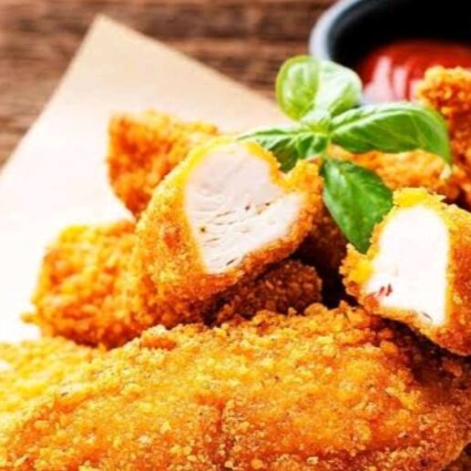 Filé de frango empanado, morando na manteiga, com macarrão ao molho branco c/;inguiça calabresa, acompanhado de arroz e feijão.