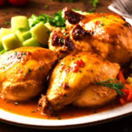 Frango de panela , acompanhado macarrão alho e óleo de jiló refogado, angu cremoso, arroz e feijão.