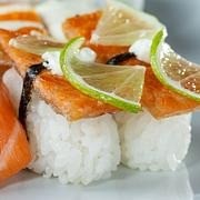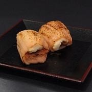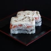 2 Uramakis Filadélfia com filete de salmão por cima.