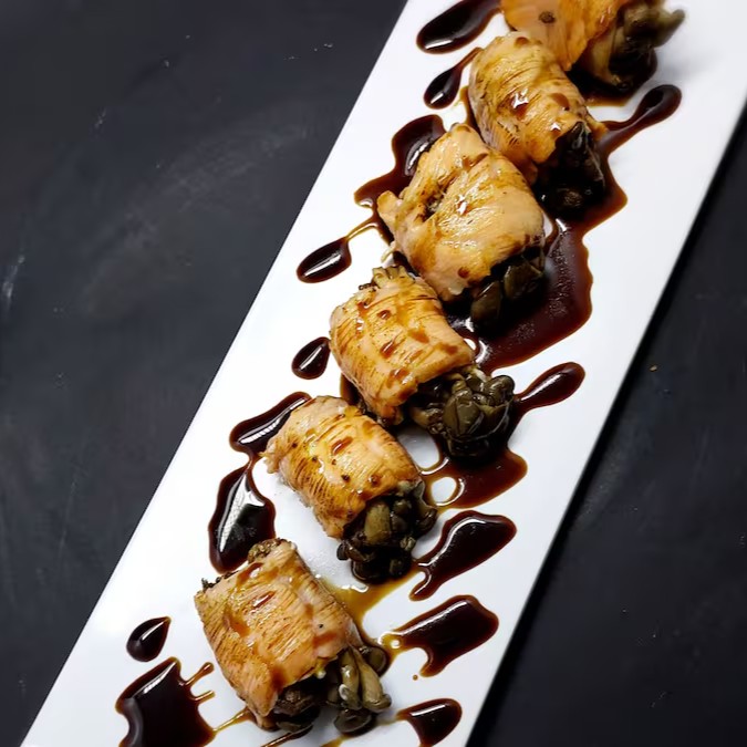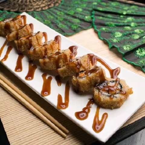 4 sobrepostos com cream cheese, todo flambado no maçarico e finalizado com um exclusivo teriyaki especial do J-San;
