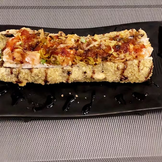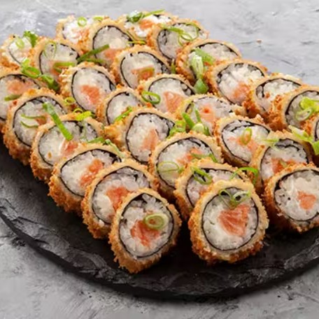 Hot crocante, empanado na farinha Panko, aberto por inteiro, com muuuiiitooo recheio de Salmão Philadelphia, sobreposto com Crispy de Alho Poró e finalizado com uma deliciosa geleia de pimenta da casa.