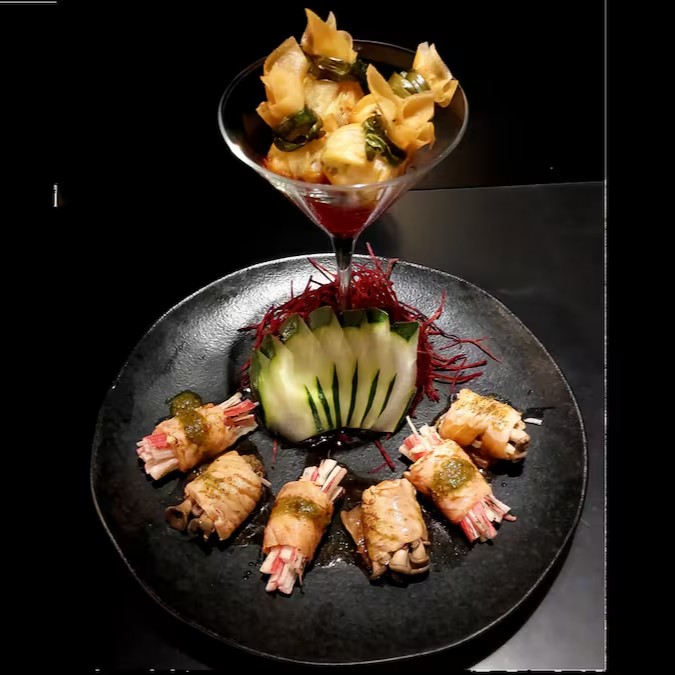 2 Gunkan de Pepino com crispy de alho poró e Geléia de Pimenta suave;