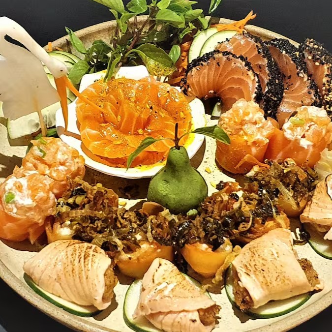 4 sobrepostos com tartar fresco de salmão e cream cheese;