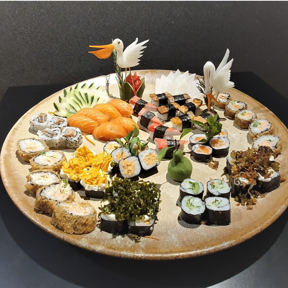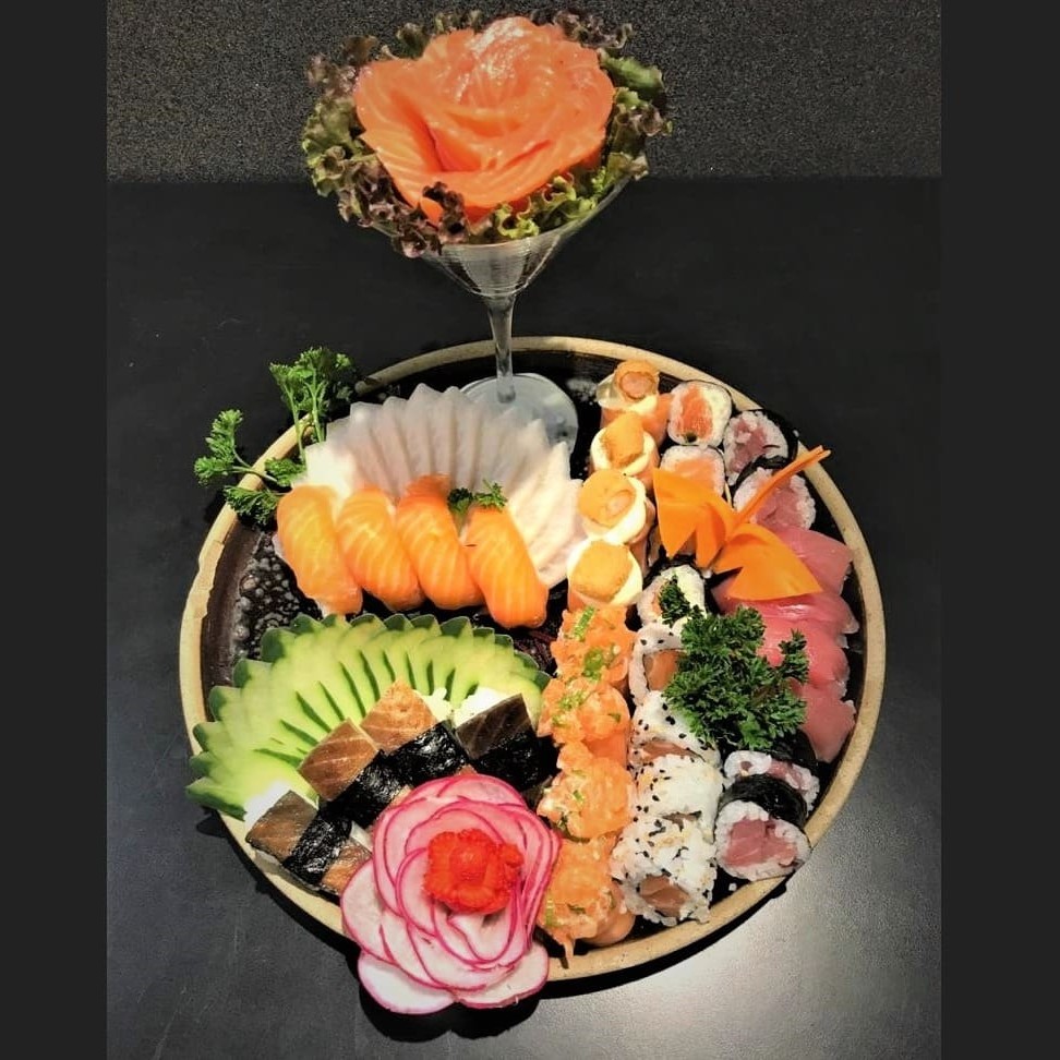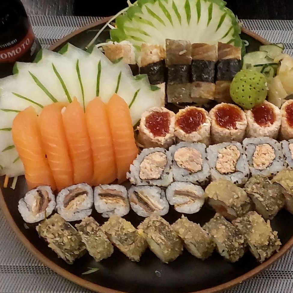Combinado especial com 60 peças (10 hot Philadelphia, 6 niguiri salmão, 6 niguiri skin, 4 niguiri kani, 4 maki Philadelphia, 4 kappa, 4 salmão, 6 salmão grelhado, 4 skin, 4 couve crispy, 4 alho poró, 4 Doritos)