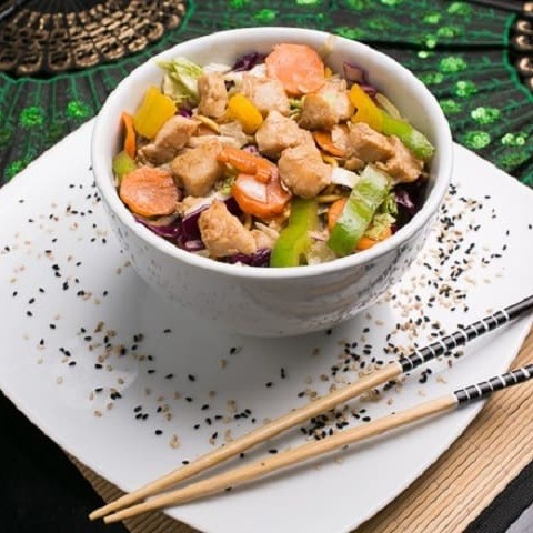 Macarrão oriental com legumes, cubos de frangos e especiarias.