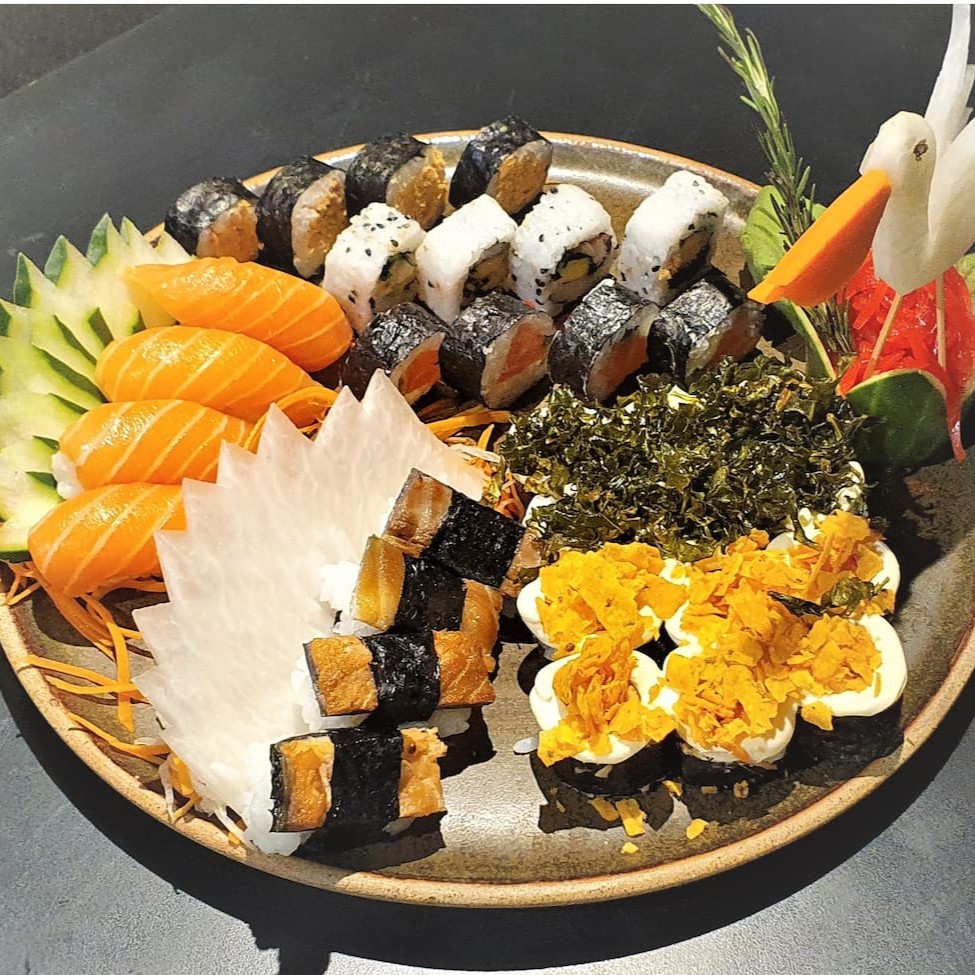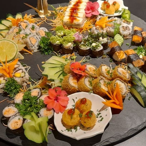 O padrão J-San em um combinado Vegano exclusivo: 4 Mini Temaki Vegan (cenoura, pepino e manga em tiras); 4 Sashimi de Manga com limão, finalizado com flor de sal; 2 Niguiri de Palmito com Geléia de Maracujá; 2 Niguiri de Tomate Seco com Manjericão; 4 Kappa Maki (hossomaki de pepino fatiado); 4 Uramaki de Palmito com Tomate Seco;