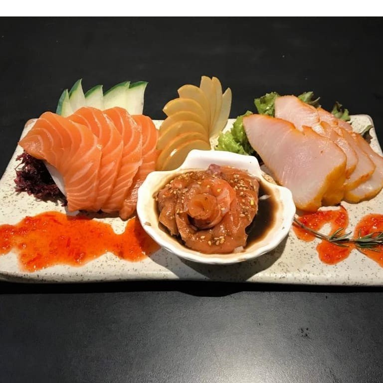 5 sashimi salmão simples, 5 sashimi salmão especial, 4 sashimi atum, 4 sashimi peixe branco. (Acompanha Kit para 2 pessoas)