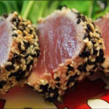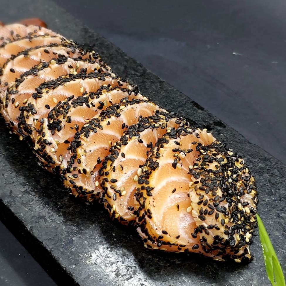 Sashimi de salmão em crosta de gergelim, regado ao molho à base de gengibre e mel. 8 unidades
