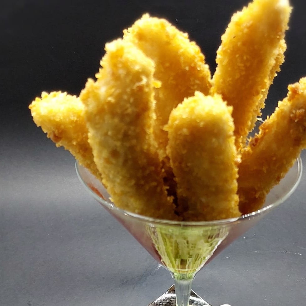 Palitos de tilápia, empanados na farinha panko. Acompanha geléia de pimenta. 8 unidades.
