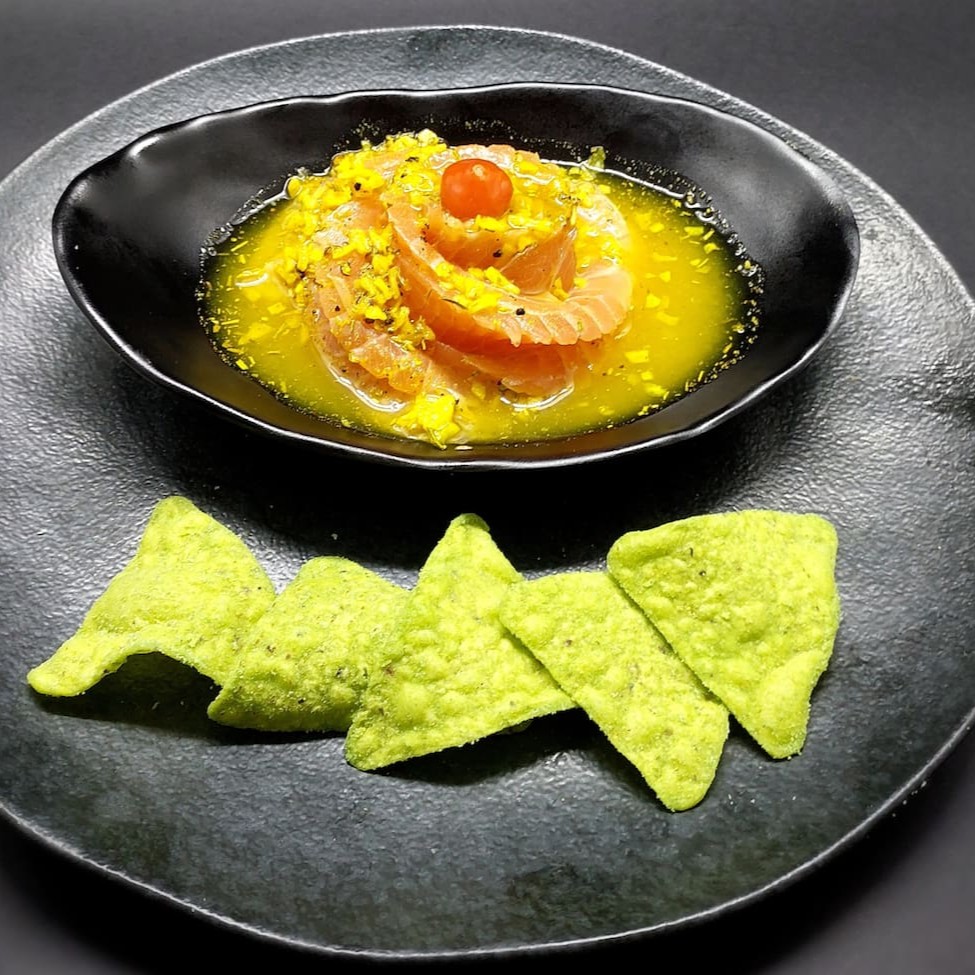 Finas fatias de salmão regadas ao molho cítrico à base de azeite extra virgem, limão e especiarias, finalizado com um toque picante. 10 fatias