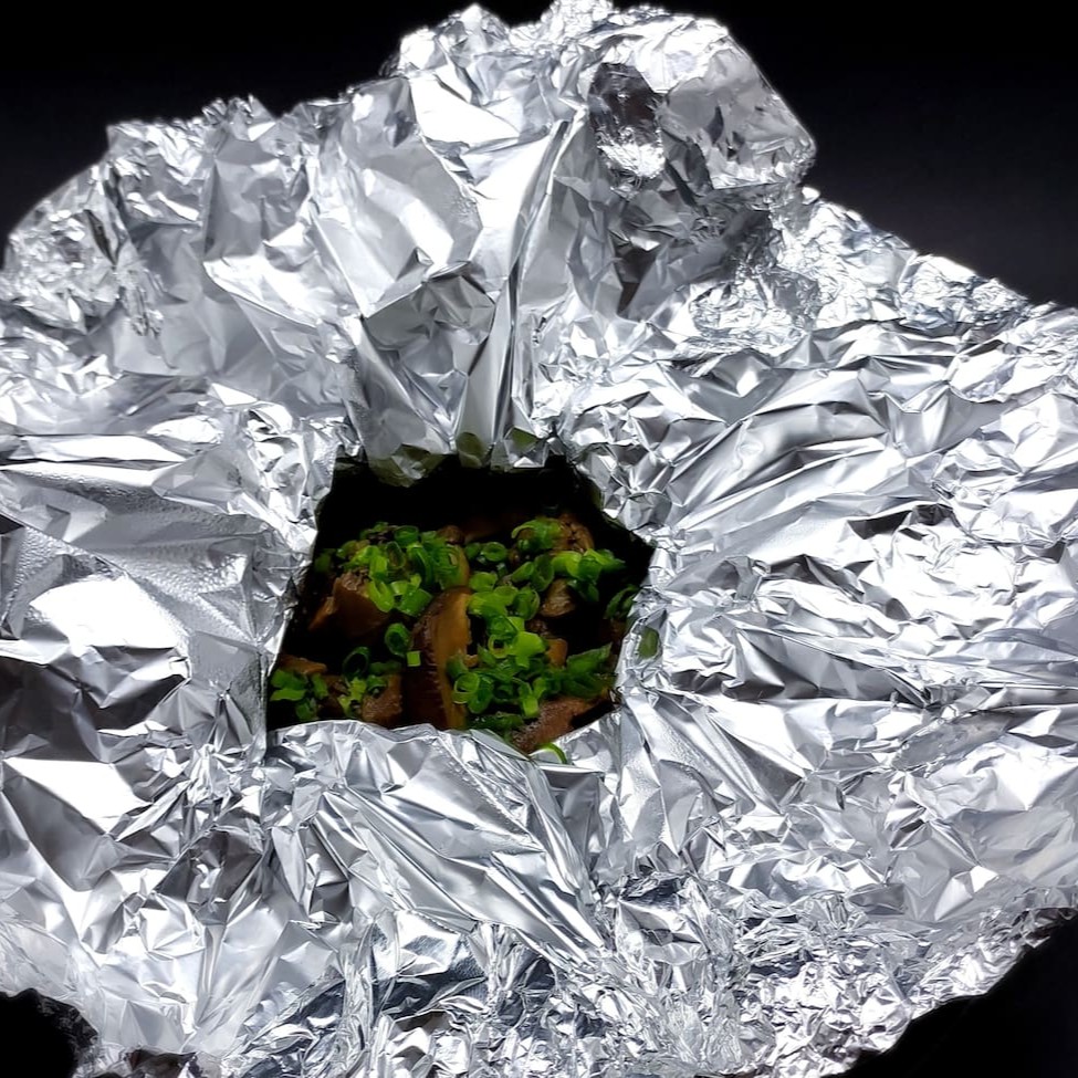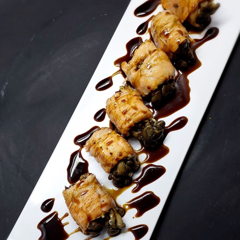 Shimeji escuro na manteiga, envolto em salmão levemente maçaricado e finalizado com molho Teriyaki. 6 unidades.