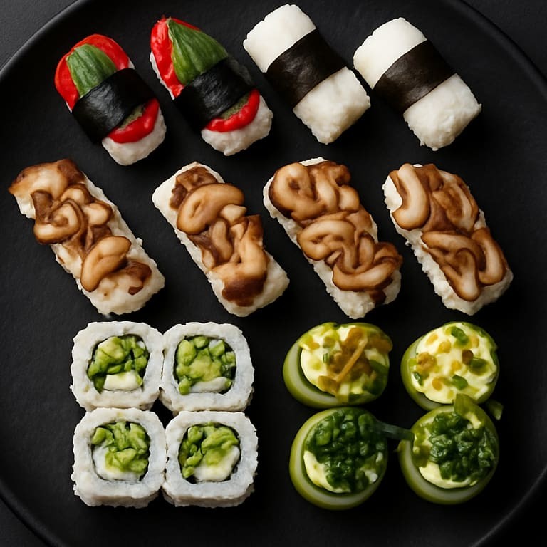 O padrão J-San em um combinado Vegano exclusivo: 4 Niguiri de Shimeji 2 Gunkan de Pepino com crispy de couve e Teriyaki; 2 Gunkan de Pepino com crispy de alho poró e Geléia de Pimenta suave; 2 Niguiri de Palmito; 2 Niguiri de Tomate Secom com Manjericão; 4 Uramaki de Sunomono;