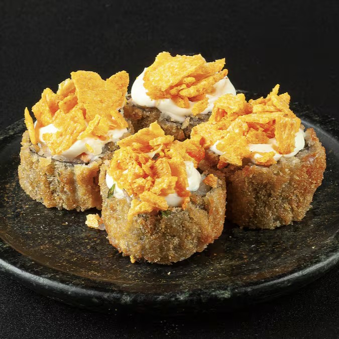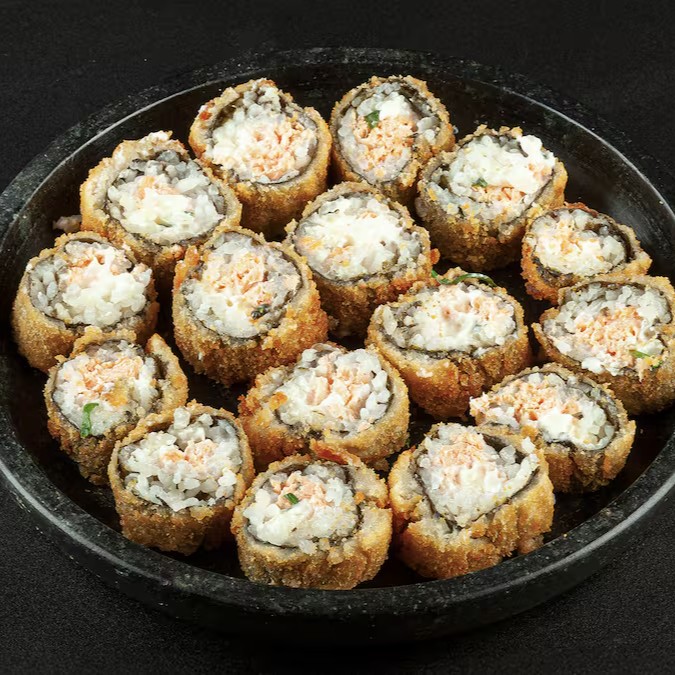 Tradicional e crocante enrolado de Salmão, Cream Cheese empanados na Farinha Panko.