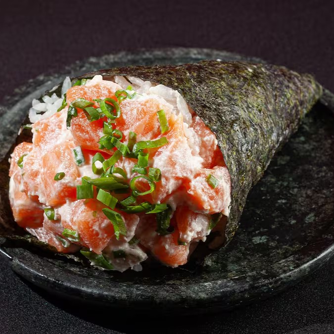 Simplicidade e frescor em cada mordida: cubos de salmão fresco com cebolinha, enrolados na alga com arroz, para um clássico sempre delicioso.