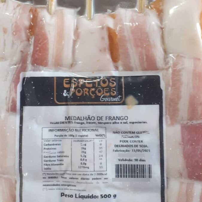 Espetinho de frango enrolado numa fatia de bacon. Produto congelado e embalado a vácuo em pacotes de 500g contendo 5 unidades.