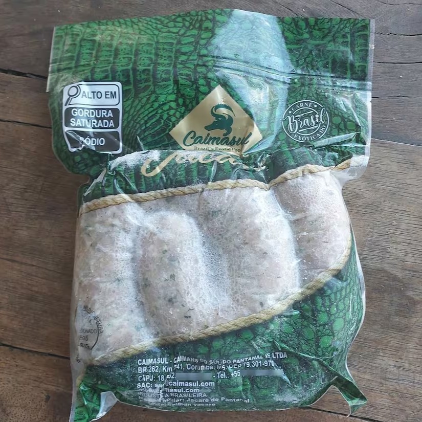 Seu paladar merece conhecer esta iguaria. A linguiça Corumbá é especialmente preparada com carne de jacaré pura e vem congelada para preservar todo o seu sabor e suculência. O pacote armazena 500 gramas.