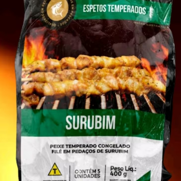 Espeto de surubim temperado e congelado. Embalagem com 400 gramas contém 5 espetos. Produto delicioso e super prático.
